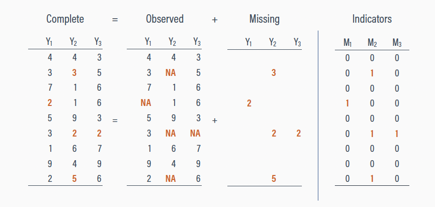 \[Y = Y_\text{obs} + Y_\text{mis}\]