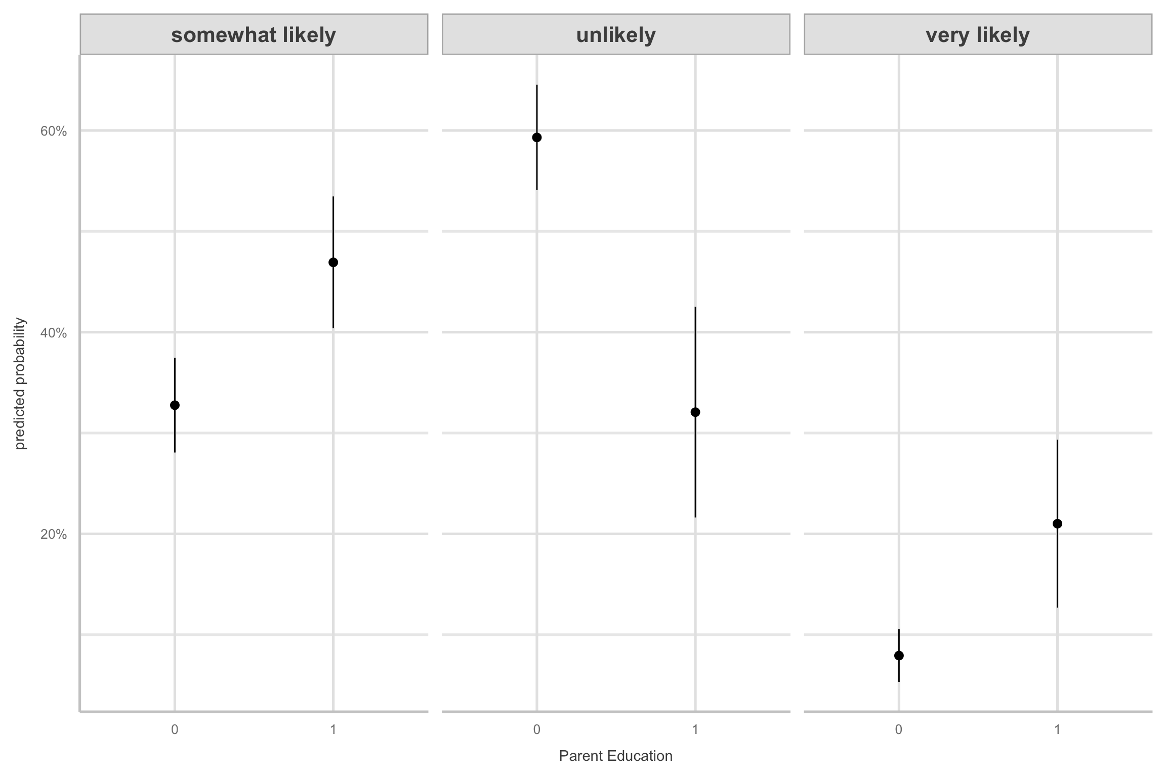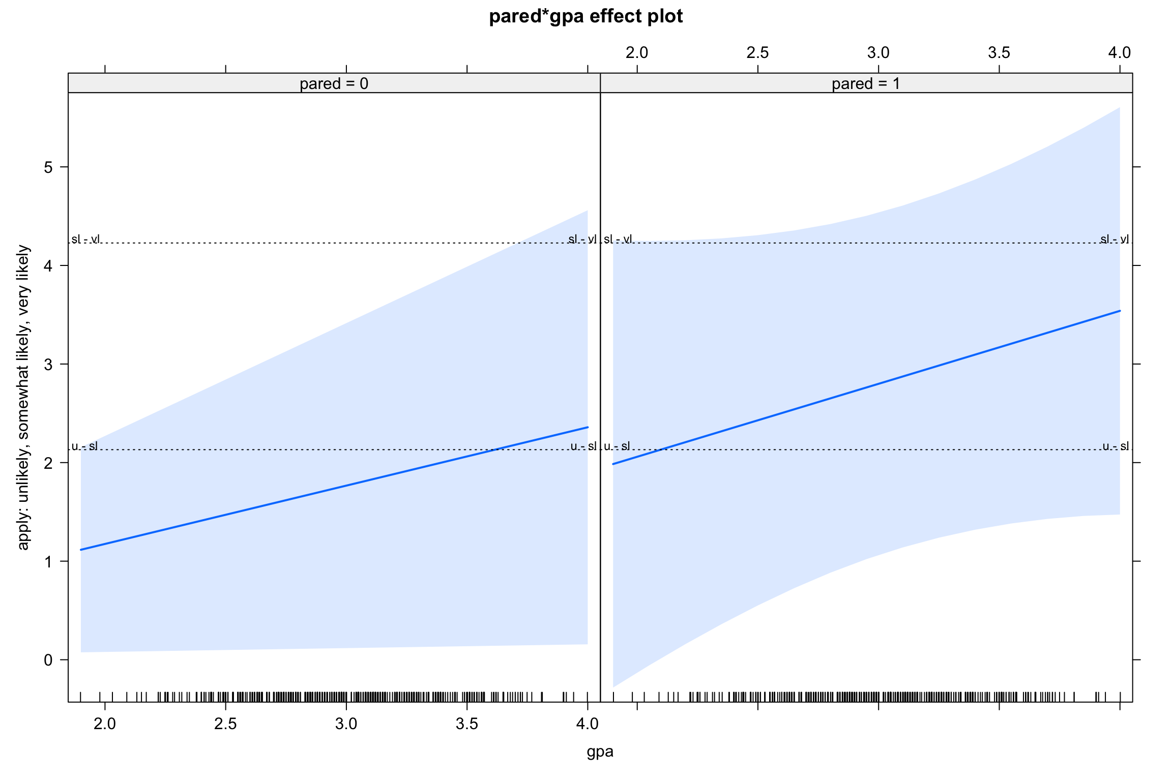 exp the log cumulative odds!Almost 3x more likely to apply to college if parent went to college