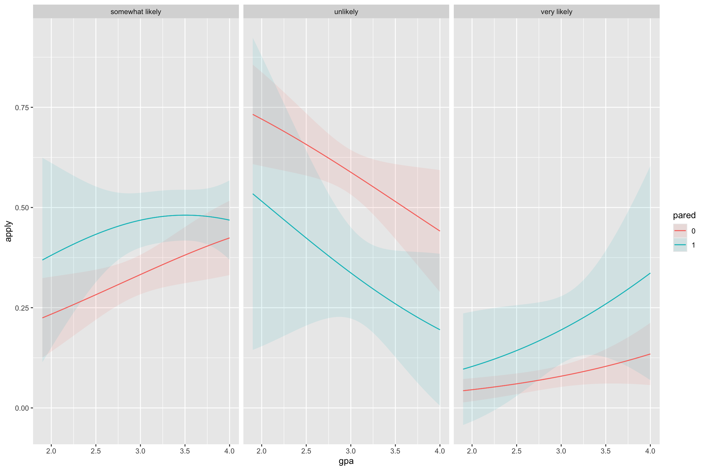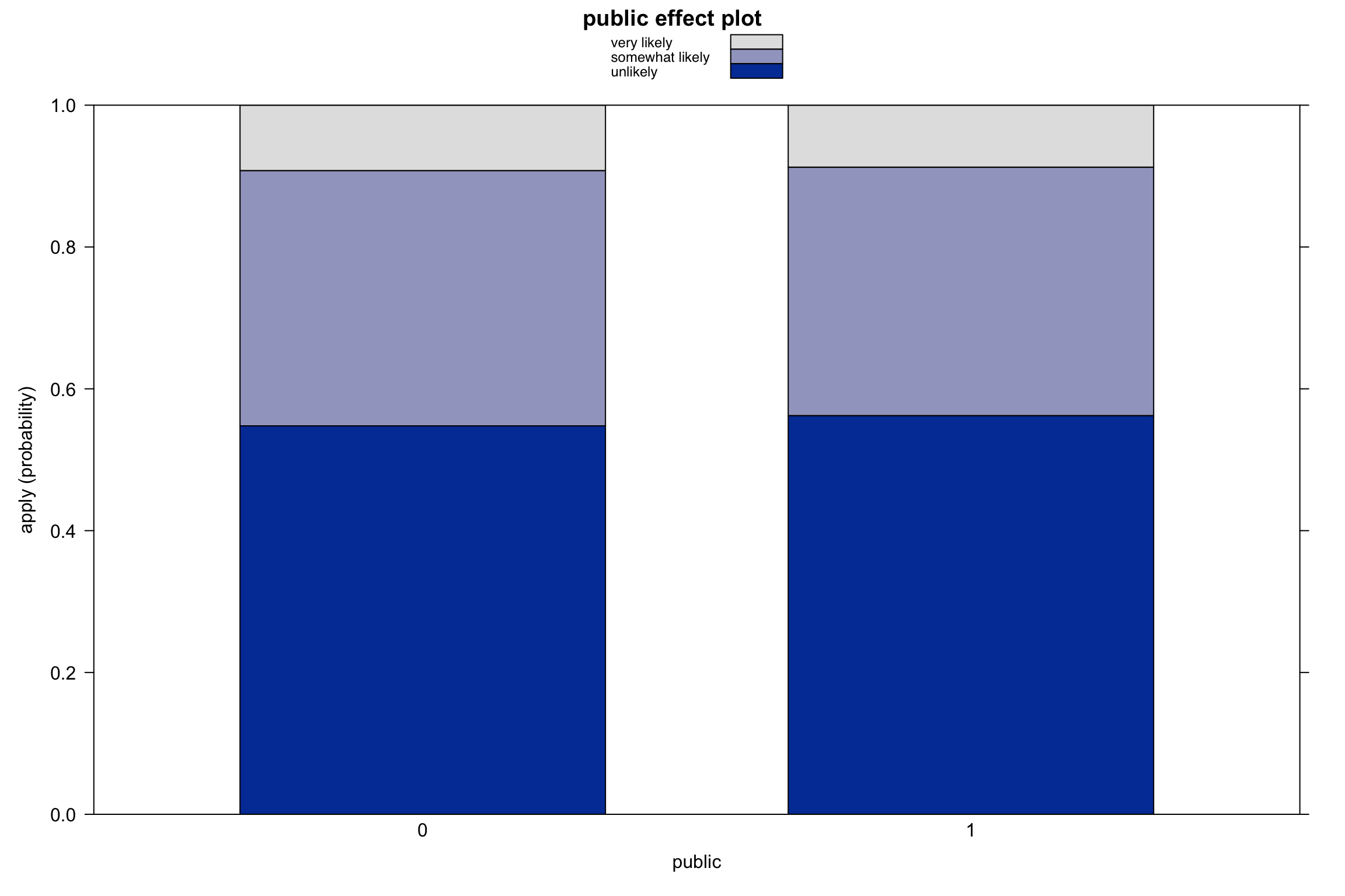 Undergraduate students report how likely they were to apply to graduate school (apply): “Unlikely”, “Somewhat Likely”, “Very likely”