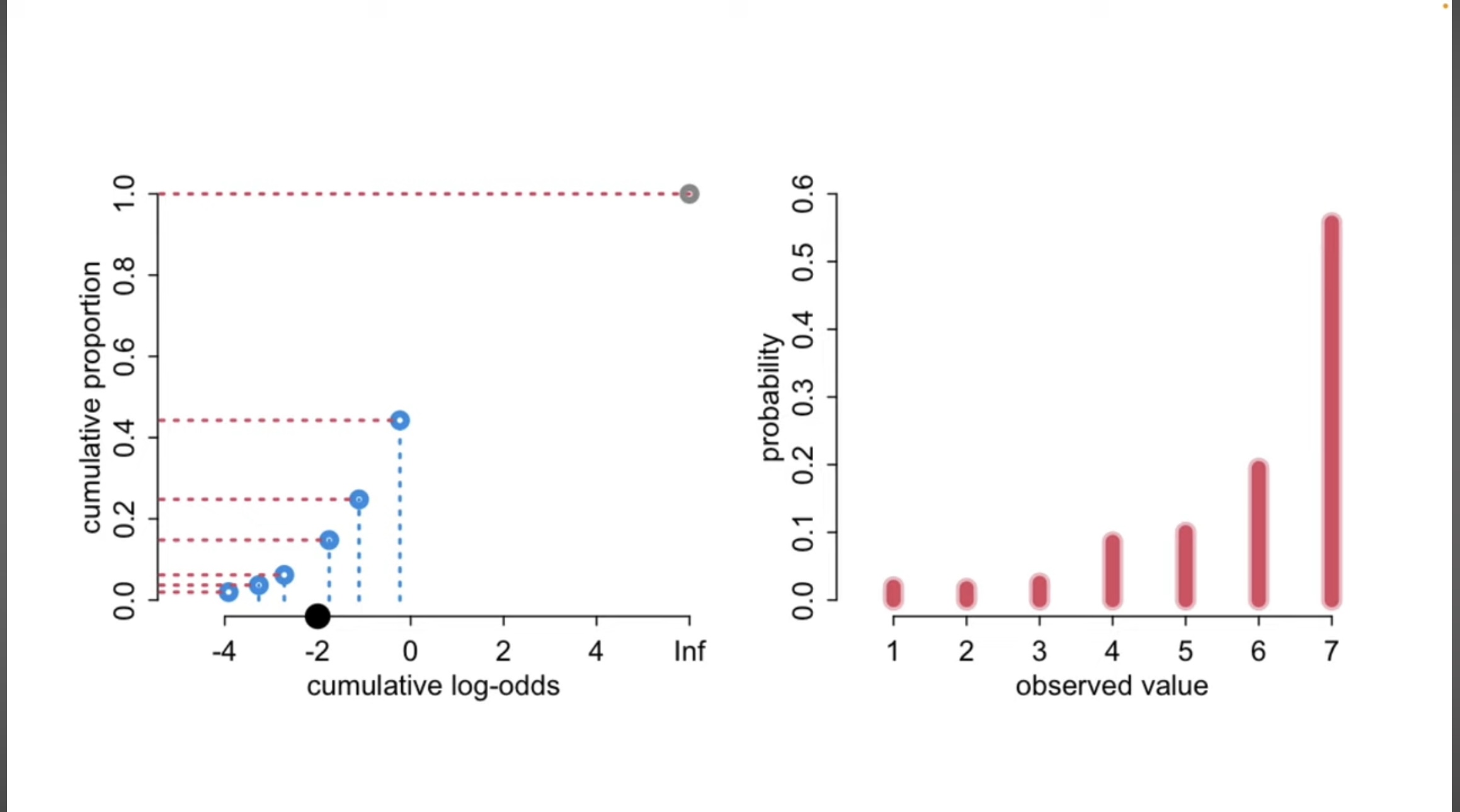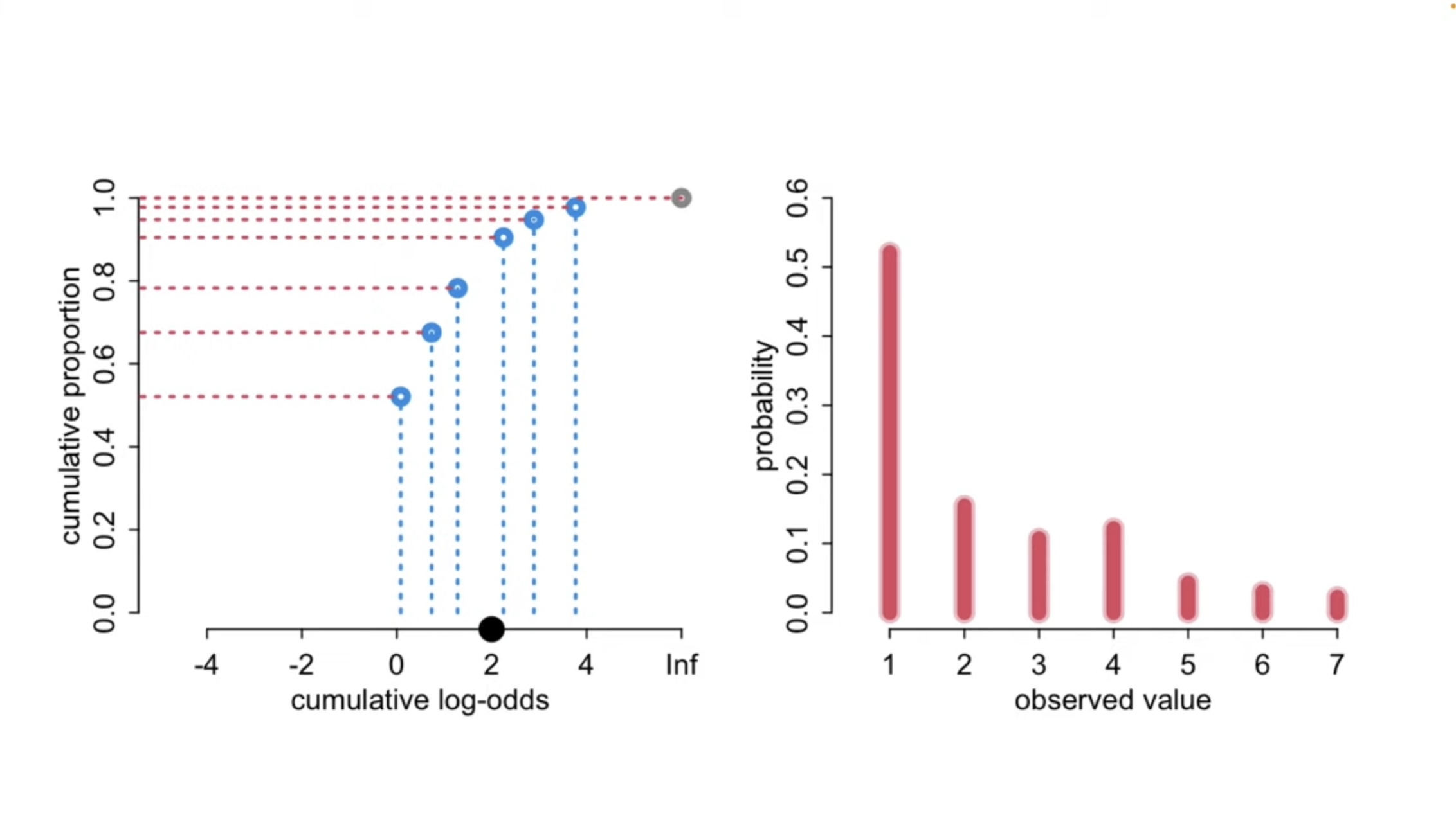\(\alpha\) (intercepts/thresholds/cut-offs) = Log-odds of falling into or below category