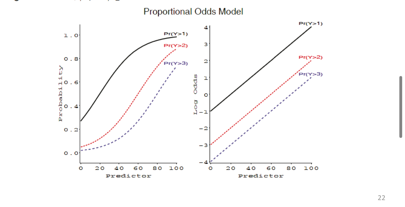Each equation as a different intercept \(\alpha_k\) (thresholds/cut points) but a common slope \(\beta\)